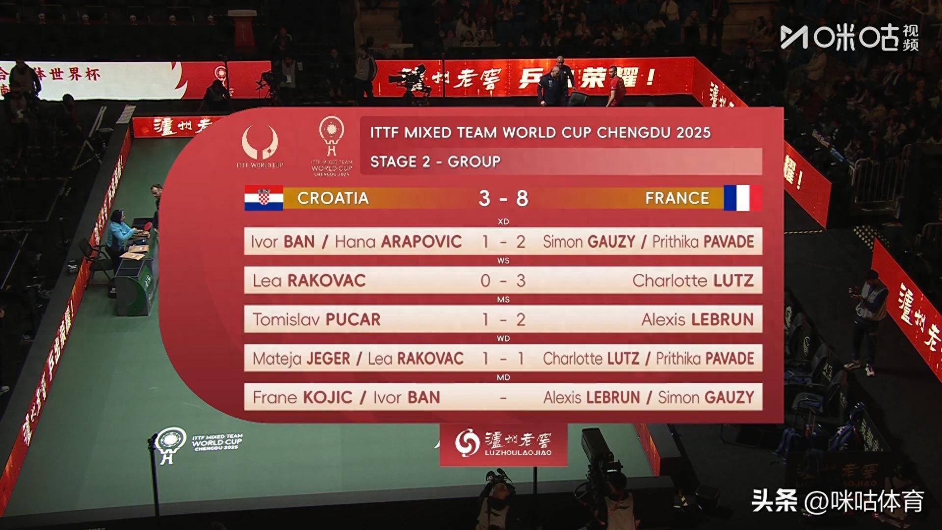 最后一场双打比赛,帕瓦德/卢茨与叶格/拉科瓦奇战至1-1平,比赛已无悬念。 本届成都混团世界杯采用15局8胜制,